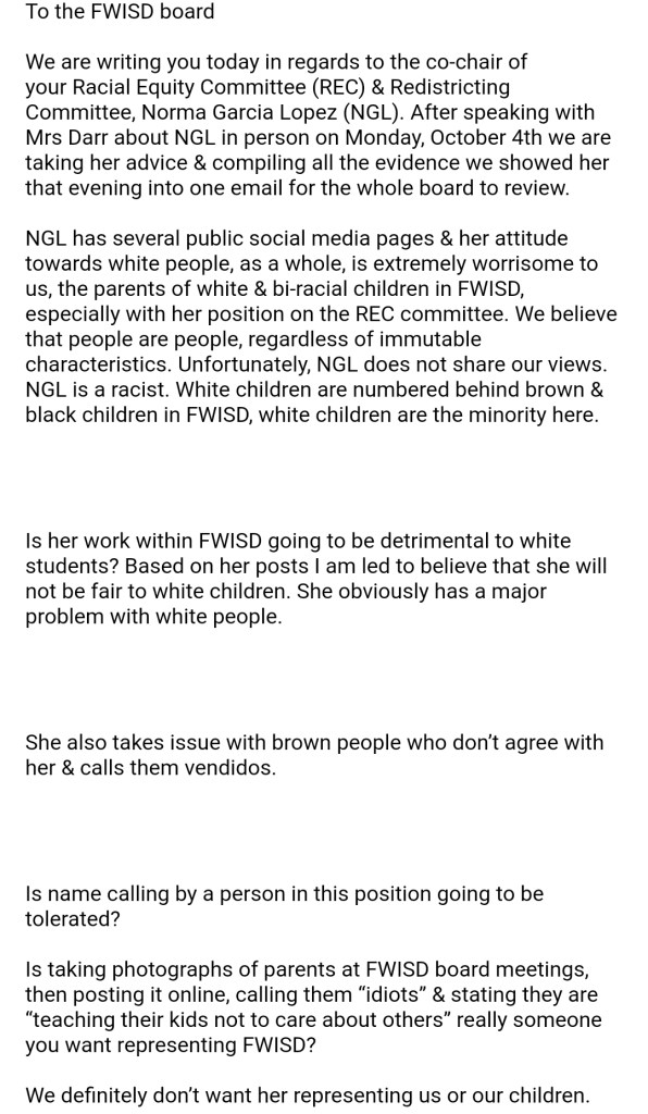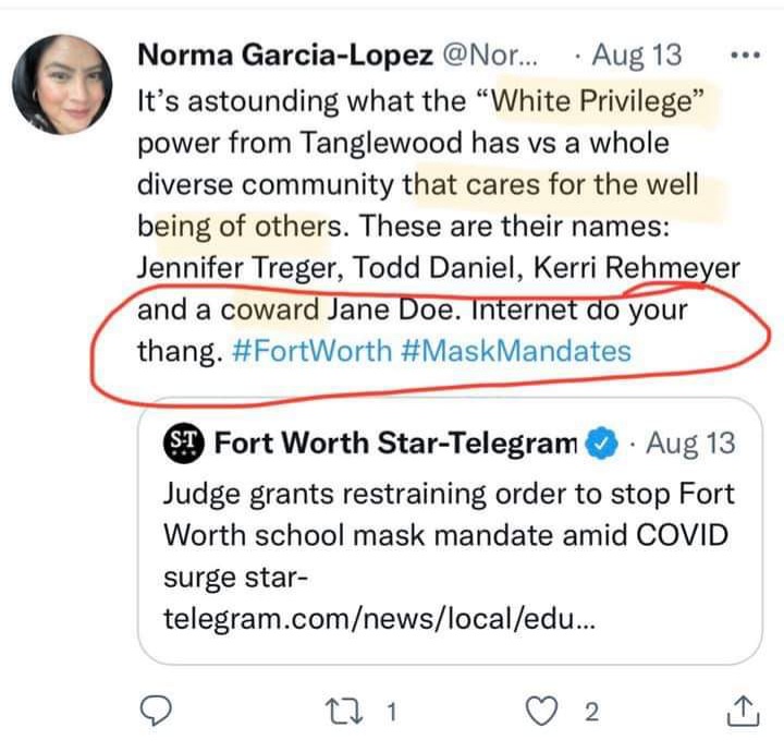 During the last several months’ parents have spoken and taken action against the FWISDs mask policy and CRT. Some parents even sued the ISD for mandating masks and won. The parents knew they would face backlash but were not expecting to be attacked on social media and doxxed. Norma Garcia Lopez, the Co-Chair of the Equity Committee for FWISD, disagreed with the parents, began harassing parents on social media, and even doxxed several because they are conservative parents against mask mandates. The parents who sued the ISD have been harassed, bullied, and intimidated because they are fighting for their kids. Norma doxxed the parents by posting their addresses, phone numbers, and other sensitive information to the public.