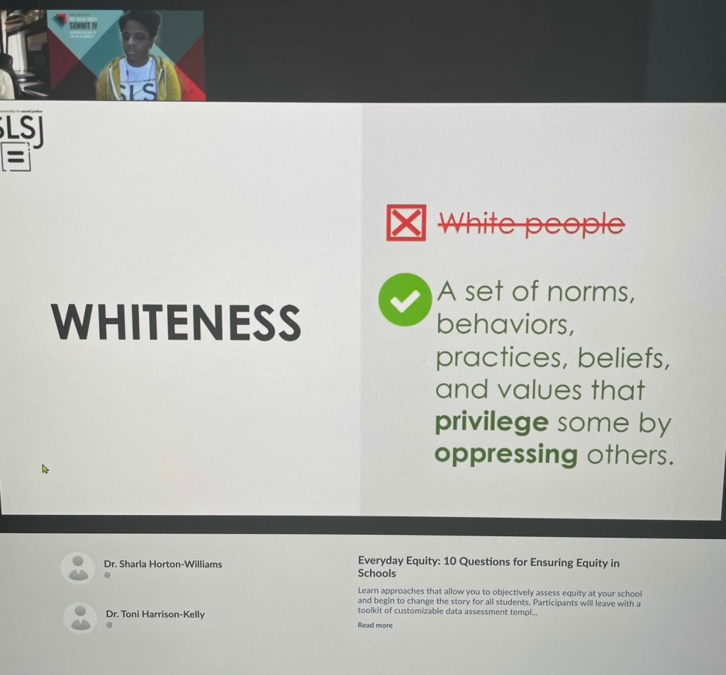 The second presenter shows how everyone is operating whiteness. They clarify that they do not mean white people but a system of power and oppression. But that begs the question if it’s not for white people, why call it whiteness?