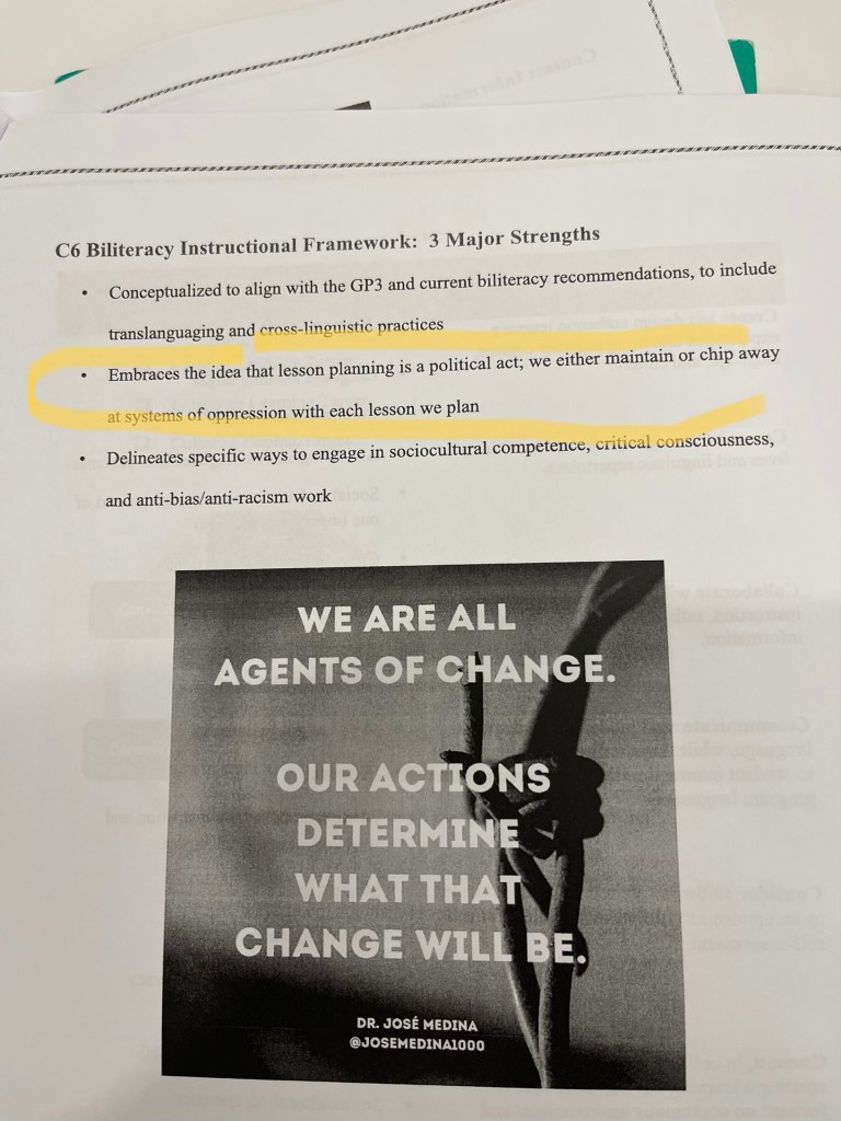 The workshop for FWISD teachers had a packet for training called “Serving Culturally and Linguistically Diverse Students in an ESL Setting.” Medina made the teachers review the book called “Boys Don’t Cry” which is a Gender Fluidity book telling a story of a boy expressing his feminine side and coming out as gay. The packet states, “the idea that lesson planning is a political act: we either maintain or chip away at systems of oppression with each lesson we plan.” It even goes on to say the framework should have an “anti-bias/anti-racism work.” Buzzwords that CRT activists use.